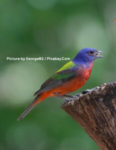 A vibrant Painted Bunting (Passerina ciris) perches alertly on the edge of a weathered wooden post, its body angled slightly to the right as it holds a small, pale seed or insect in its stout, conical beak. The bird displays an extraordinary palette of colors: a deep, saturated blue head with a subtle red eye-ring, transitioning to a bright lime-green back and wings that blend into darker tones, while its underparts glow with a rich, fiery red-orange that extends down to the tail feathers, which fade into a softer brownish hue. Its legs and feet grip the rough texture of the wood firmly, and the background consists of a soft, out-of-focus green foliage that creates a natural, serene setting. Picture by GeorgeB2 / Pixabay.Com.