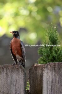 An American Robin (Turdus migratorius) perches alertly atop a weathered wooden fence post, its body angled slightly to the left as it gazes upward with a bright, watchful eye. The bird displays the species’ classic plumage: a vibrant orange-red breast and throat, contrasting sharply with its dark grayish-black head, back, and wings that show subtle white edging on the feathers. Its yellow-orange beak is slightly parted, and its legs grip the rough, splintered edge of the aged gray fence. In the softly blurred background, lush green foliage creates a bokeh effect of light and color, with a small evergreen shrub visible to the right, adding depth to the natural outdoor setting. Picture by kcfina / Pixabay.Com.
