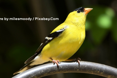 A vibrant American Goldfinch (Spinus tristis) perches alertly on a dark curved metal rail, its body glowing with intense lemon-yellow plumage that covers the breast, belly, and back while a sharp black cap crowns its head and extends down to frame its bright eye. The bird’s wings display a striking contrast of deep black feathers accented by bold white patches along the edges, and its short conical beak shines in a vivid orange hue as it points slightly upward. Its pinkish legs grip the perch firmly with sharp claws, and the tail feathers show a mix of black and white at the tips. The entire scene is set against a softly blurred backdrop of lush green foliage that emphasizes the finch’s crisp details and brilliant coloration. Picture by milesmoody / Pixabay.Com.