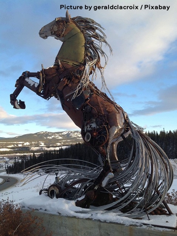The image shows “The Horse of Whitehorse,” a striking public art sculpture located in Whitehorse, Yukon Territory, Canada. Created by artist Daphne Mennell and unveiled in 2016, this monumental rearing stallion is constructed entirely from reclaimed scrap metal, including gears, … Continue