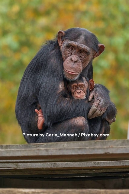 The above mage captures a tender moment between a mother Chimpanzee (Pan troglodytes} and her young infant in what appears to be a natural outdoor enclosure. The adult Chimpanzee, with dark glossy fur and expressive brown eyes, sits upright on … Continue